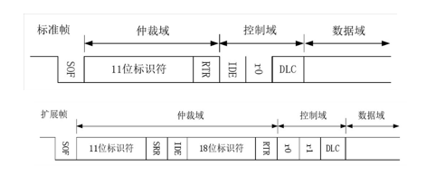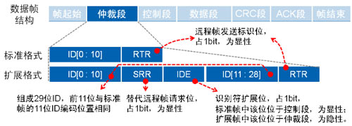 與數(shù)據(jù)幀相比,遠(yuǎn)程幀結(jié)構(gòu)上無數(shù)據(jù)段,由6個(gè)段組成,同 理分標(biāo)準(zhǔn)幀格式和擴(kuò)展幀格式,且RTR位為1(隱性電平)。