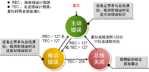 為防止自身由于某些原因?qū)е聼o法正常接收額節(jié)點(diǎn)一直發(fā)送錯(cuò)誤幀,干擾其他節(jié)點(diǎn)通信,CAN BUS 規(guī)定了節(jié)點(diǎn)的3種狀態(tài)及其行為。